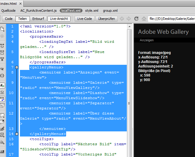 4. Im Code die markierte Stelle suchen und entfernen. Aufpassen, dass wirklich nur der Abschnitt von <galleryMenus> bis </galleryMenus> gelöscht wird.
