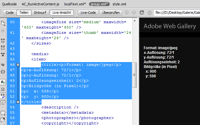 6. Die Datei group.xml aktivieren. Im Codebereich folgende Stellen suchen und entfernen - die Anzahl richtet sich nach der Anzahl der Galerie-Bilder.